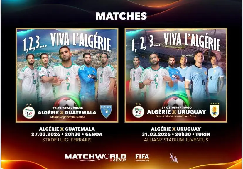 Matchworld annonce l’organisation de deux rencontres internationales impliquant l’équipe nationale d’Algérie en Italie à la fin du mois de mars 2026 :
