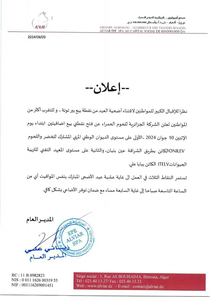 🟢 À LIRE AUSSI : À partir de 59 000 DA : ALVIAR met en vente des moutons de l’Aïd Al-Adha à prix fixes