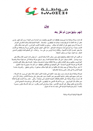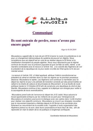 Dans un communiqué diffusé sur FACEBOOK intitulé » Ils sont entrain de perdre nous n’avons pas encore gagnée » le mouvement Mouwatana « Nous nous réjouissons que le système continue de reculer sous la pression populaire et que l’armée se raille même si de manière contestable avec le recours à l’article 102″ que le mouvement El Mouwatana rejette, « s’il était appliqué attribue l’intérim constitutionnel au président du sénat et maintien donc la main du régime sur le prochain processus électoral. »