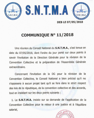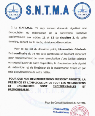 Le SNTMA confirme n’avoir reçu aucune demande ‘Signifiant une dénonciation ou modification de la convention collective conformément aux articles 11 et 12 du chapitre 2″. Il ajoute : Pour que nos revendications puissent aboutir, la présence et l’aboutissement de tout les mécaniciens et ingénieurs sont dispensables et primordiales ». « La grève est un droit en 2018, c’est devenu un devoir » écrit le SNTMA.
