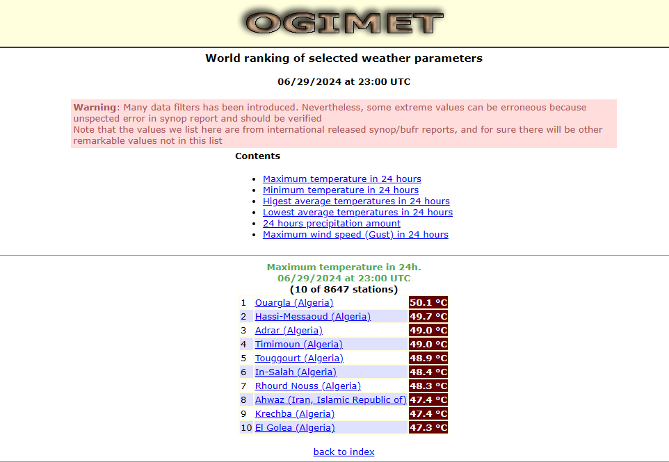 Avec ses 50,1°C, Ouargla se rapproche à moins de 6° du record mondial absolu, établi à Furnace Creek, dans la vallée de la Mort en Californie, le 10 juillet 1913, avec une température caniculaire de 56,7°C.