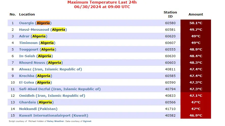 Aujourd’hui encore, la chaleur persiste, avec 10 villes algériennes parmi les plus chaudes du monde selon Eldorado Weather. Ouargla reste en tête avec 50,1°C, suivie de Hassi-Messaoud (49,7°C), Adrar (49°C), Timimoun (49°C) et Touggourt (48,9°C) :