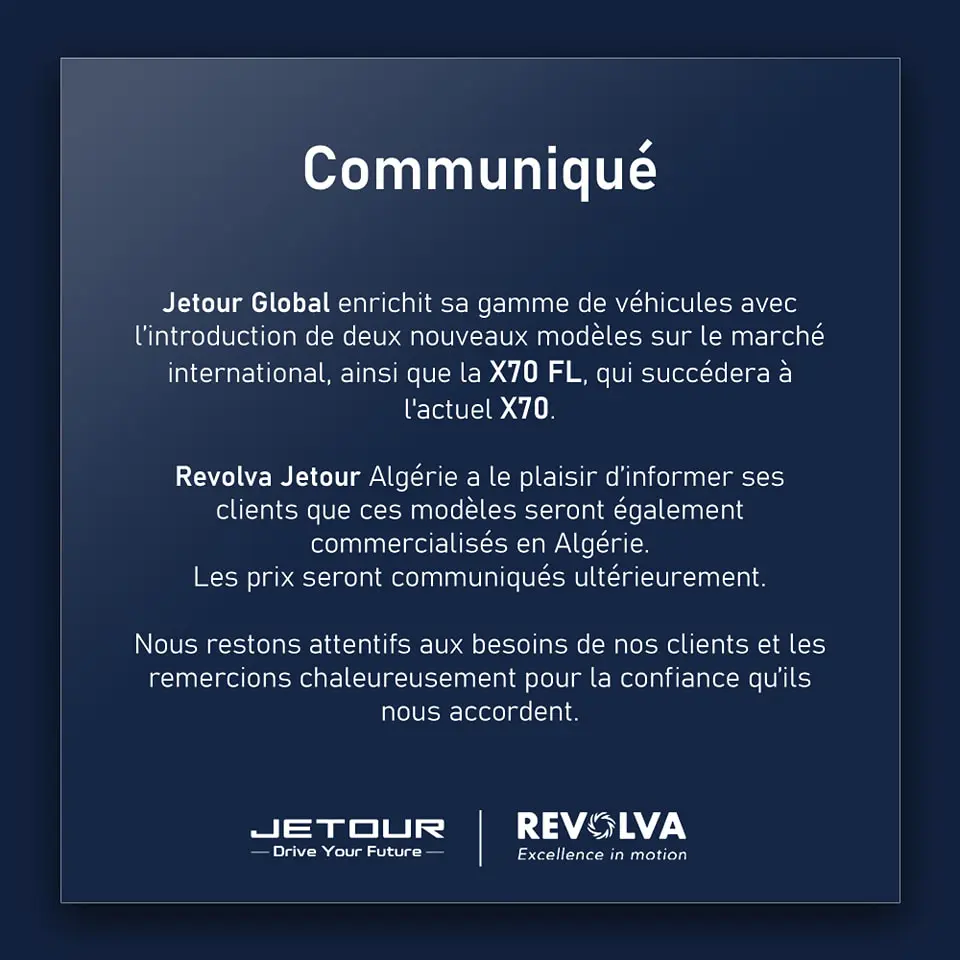 Dans son communiqué, Revolva Jetour Algérie a indiqué que les prix de sa nouvelle gamme seront dévoilés ultérieurement.