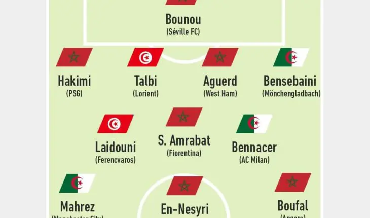 Dans le onze type maghrébin de l’année 2022, on constate que les joueurs marocains sont présents en force. Ils sont 6, en l’occurrence le gardien de but Yassine Bounou (FC Séville), les deux défenseurs Achraf Hakimi (PSG) et Nayef Aguerd (West Ham), Sofyan Amrabat (Fiorentina), Sofiane Boufal (SCO Angers) et enfin Youssef En-Nessyri (FC Séville).