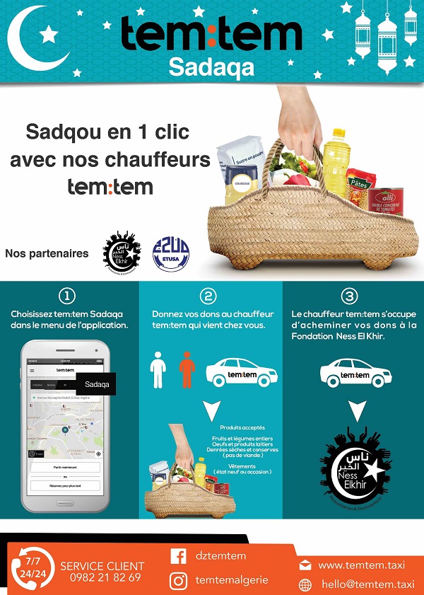 Pour ce faire, tem:tem, ses chauffeurs partenaires, l’ETUSA et la fondation Ness el Khir se mobilisent ensemble pendant le Ramadan pour offrir aux algérois la possibilité d’effectuer leurs dons alimentaire (Fruits et légumes entiers, œufs et produits laitiers, denrées sèches et conserves ; pas de viande), et vestimentaire (état neuf ou occasion) en toute discrétion et avec facilité.