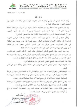 D’après un communiqué de presse publié par le RND, Ouyahia l’ex chef de gouvernement demande au président Abdelaziz Bouteflika de démissionner. Si les speechs précédents ce dressaient aux prés du peuple, ce communiqué se dresse officiellement contre Bouteflika, personne ne veut plus faire parti de son clan, et qu’est un Bouteflika sans son clan !