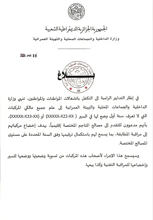Dans un communiqué publié ce dimanche, le ministère de l’Intérieur, des Collectivités locales et de l’Aménagement du territoire a appelé tous les propriétaires de véhicules dont la première mise en circulation est inconnue (xxxxx-x22-xx) ou (xxxxx-x33-xx) à se présenter auprès des services des mines compétents de leur wilaya.