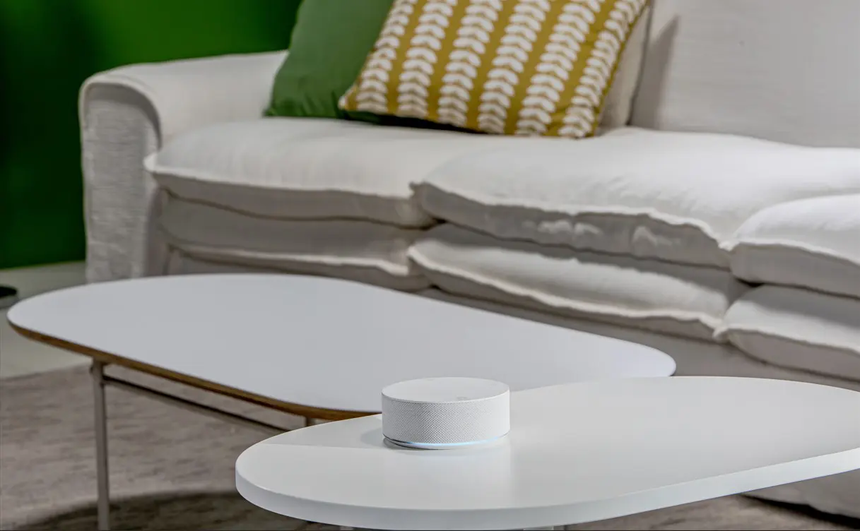 Compact et léger, le LG ThinQ ON présente une forme cylindrique et une palette de couleurs discrète (gris/blanc) qui lui permet de s’intégrer parfaitement dans n’importe quel espace ou décoration.