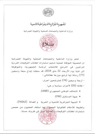 « Le bilan provisoire de la remise des formulaires de souscription de signatures individuelles pour les postulants à la candidature à la Présidence de la République, arrêté le mrecredi 22 mai 2019 compte 77 lettres d’intention déposées », rapporte le communiqué.
