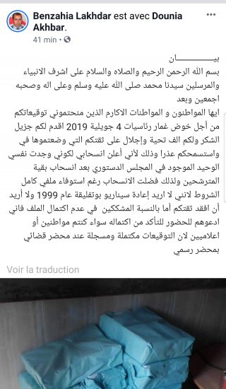 « Chères citoyennes et chers citoyens qui m’ont donné vos signatures pour la présidentielle du 4 juillet 2019, je vous adresse mes sincères remerciements pour la confiance que vous avez mise en moi. Je m’excuse auprès de vous, parce que je me retire, car, je me suis retrouvé seul au Conseil Constitutionnel, après le retrait des autres candidats, c’est pour cela que j’ai décidé de renoncer malgré que mon dossier soit complet, et je ne veux pas qu’il soit reproduit le même scénario que celui de Bouteflika en 1999 », a écrit l’ancien militaire.