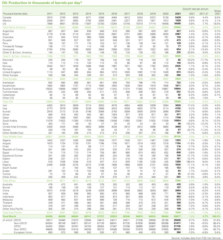 Les chiffres de la production de pétrole dans le monde (en milliers de barils par jour), pour la période 2011-2021, selon le Statistical Review of World Energy de BP.
