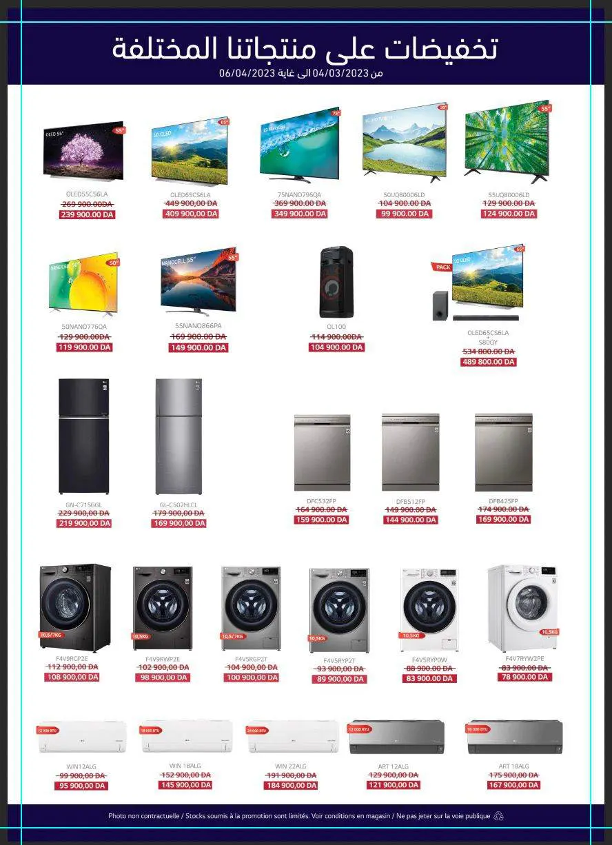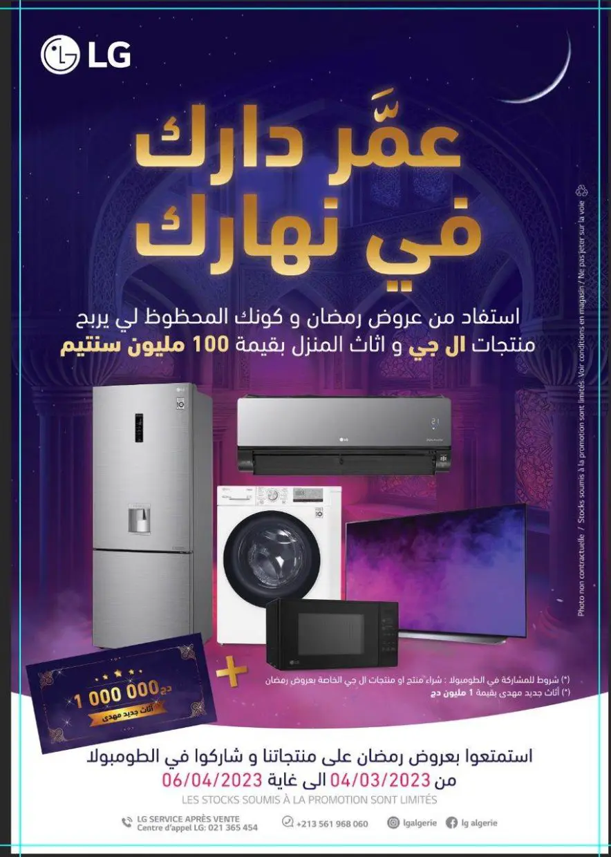 Comment y participer ? C’est très simple ! Il vous suffit d’acheter un produit LG en promotion durant la période allant du 04 mars au 06 avril et vous pourrez participer à la tombola pour tenter de gagner le pack d’équipements électroménagers de la marque LG (réfrigérateurs, téléviseur, climatiseur, machine à laver, micro ondes, cuisinière), ainsi qu’un bon d’achat d’une valeur de 1 000 000 DA de meubles et de produits déco chez les partenaires de LG.