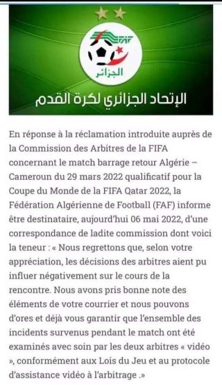 Dans un communiqué rendu public hier soir sur ses réseaux sociaux, la FAF a fait savoir que la FIFA a répondu à la réclamation introduite auprès de sa Commission d’arbitrage, contestant l’arbitrage de Bakary Gassama lors du match retour Algérie-Cameroun. « En réponse à la réclamation introduite auprès de la Commission des Arbitres de la FIFA concernant le match barrage retour Algérie – Cameroun du 29 mars 2022 qualificatif pour la Coupe du Monde de la FIFA Qatar 2022, la Fédération Algérienne de Football (FAF) informe être destinataire, aujourd’hui 06 mai 2022, d’une correspondance de ladite commission », a indiqué le communiqué de la FAF.