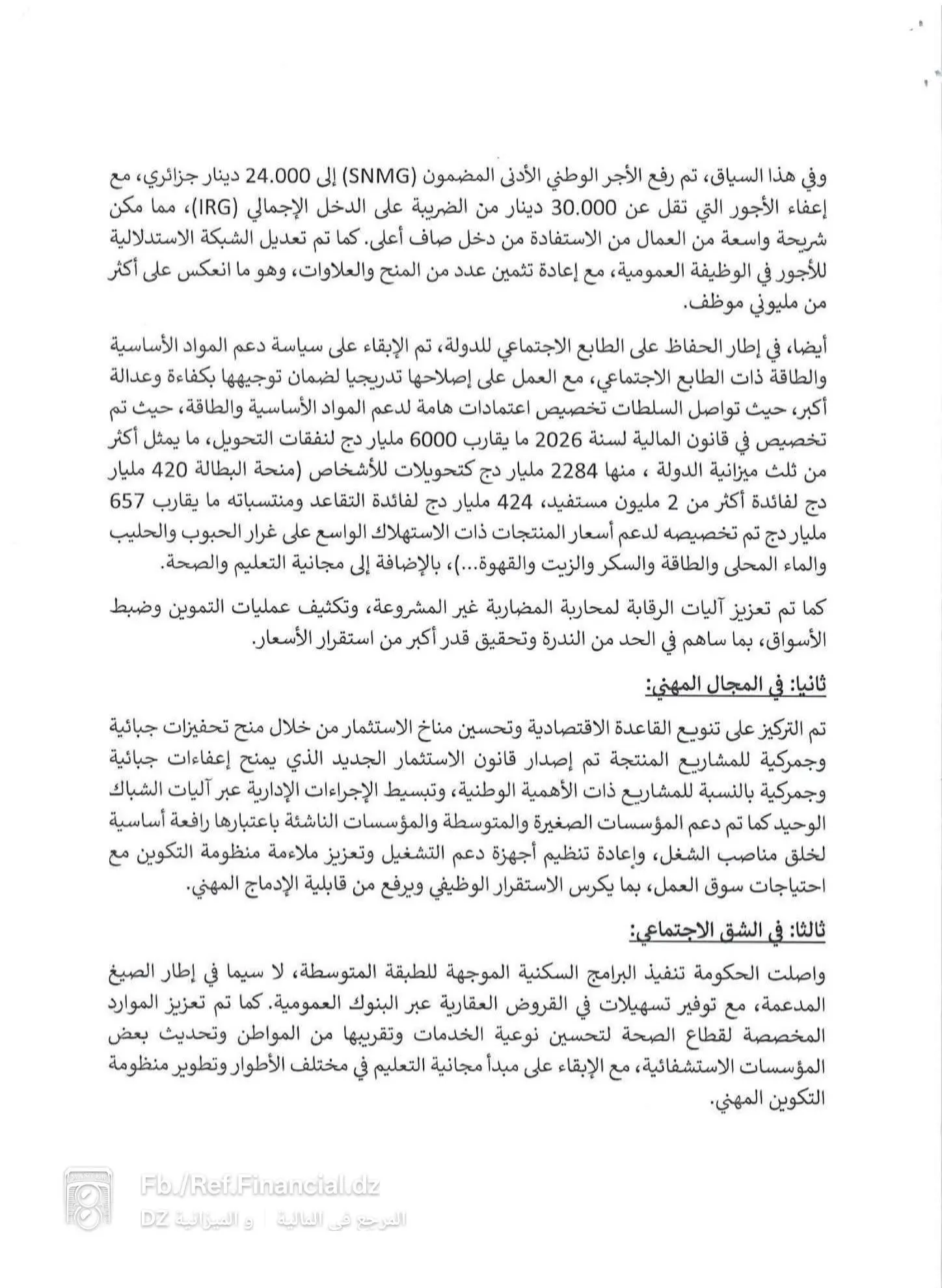 Pour l’exercice 2026, le texte évoque une enveloppe globale de 6000 milliards de dinars destinée aux dépenses de transferts, représentant plus d’un tiers du budget de l’État.