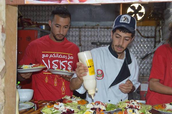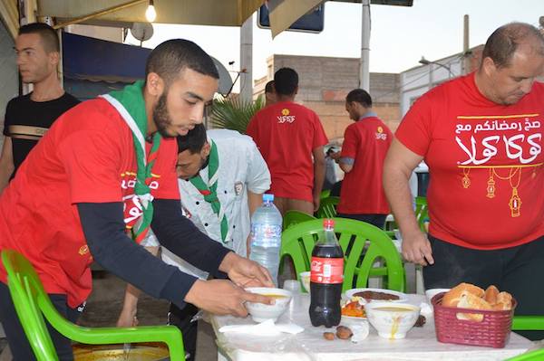 D’autres employés de l’entreprise américaine se joignent à la fête et terminent de servir les hriras, tajines zitounes, salades, et autres plats de riz au poisson sur les différentes tables avec les scouts musulmans. Ce iftar sera bien entendu arrosé de boissons de la firme internationale qui sponsorise l’opération.