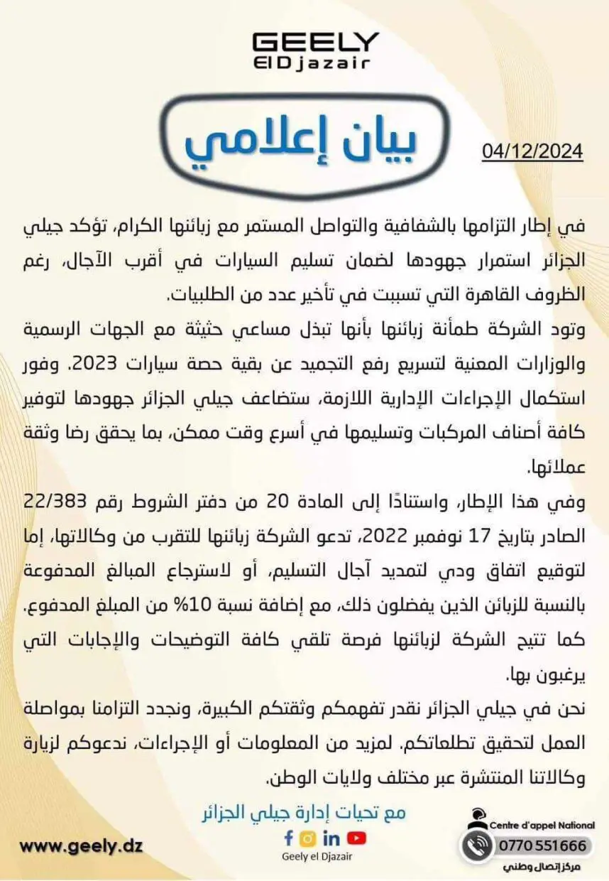 « Chez Geely Algérie, nous apprécions votre compréhension et votre confiance. Nous réaffirmons notre engagement à répondre à vos attentes. Pour plus d’informations, n’hésitez pas à vous rendre dans nos agences à travers le pays », conclut le communiqué.
