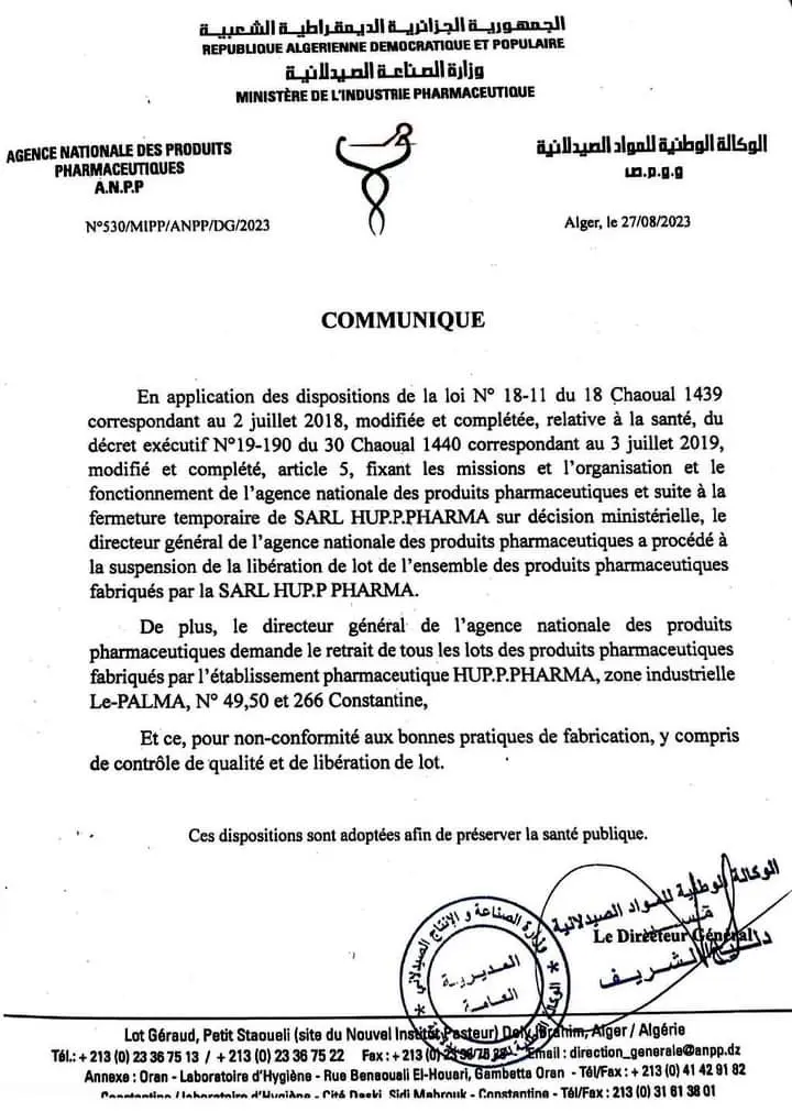 Le ministère de l’Industrie avait indiqué dans un communiqué publié le 26 aout 2023 que : « l’activité de l’entreprise pharmaceutique de production de médicaments à usage humain, Hupp Pharma, est provisoirement suspendue conformément au décret exécutif n° 21-82 du 11 Rajab 1442 correspondant au 23 février 2021 relatif aux établissements pharmaceutiques et les conditions de leur agrément ».