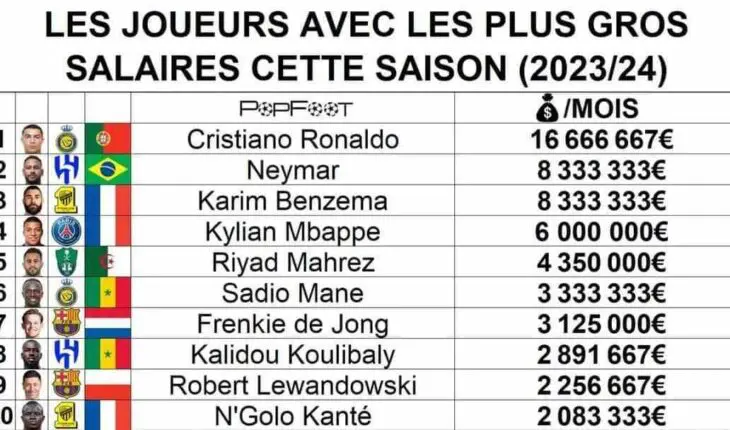 Sadio Mané (Al-Nassr Saudi) vient en 6ᵉ position, avec un salaire mensuel de plus de 3 millions d’euros. Enfin, Frenkie De Yong, Kalidou Koulibaly, Robert Lewandowski et N’Golo Kanté complètent le top 10.
