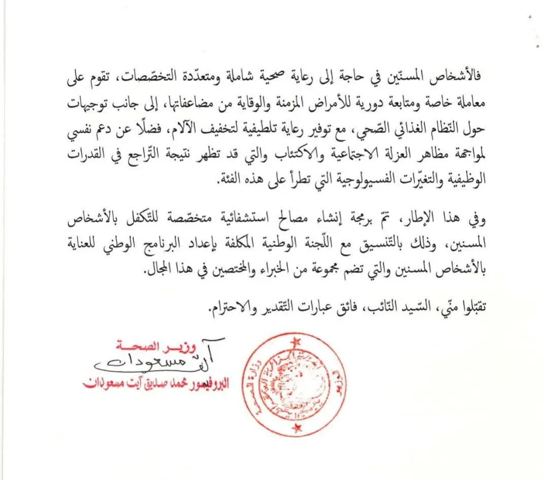 Le ministre a insisté sur l’urgence de dédier des services spécifiques et de mobiliser des ressources humaines qualifiées pour garantir une prise en charge adaptée à cette frange de la population, particulièrement vulnérable aux maladies chroniques et aux complications de santé.