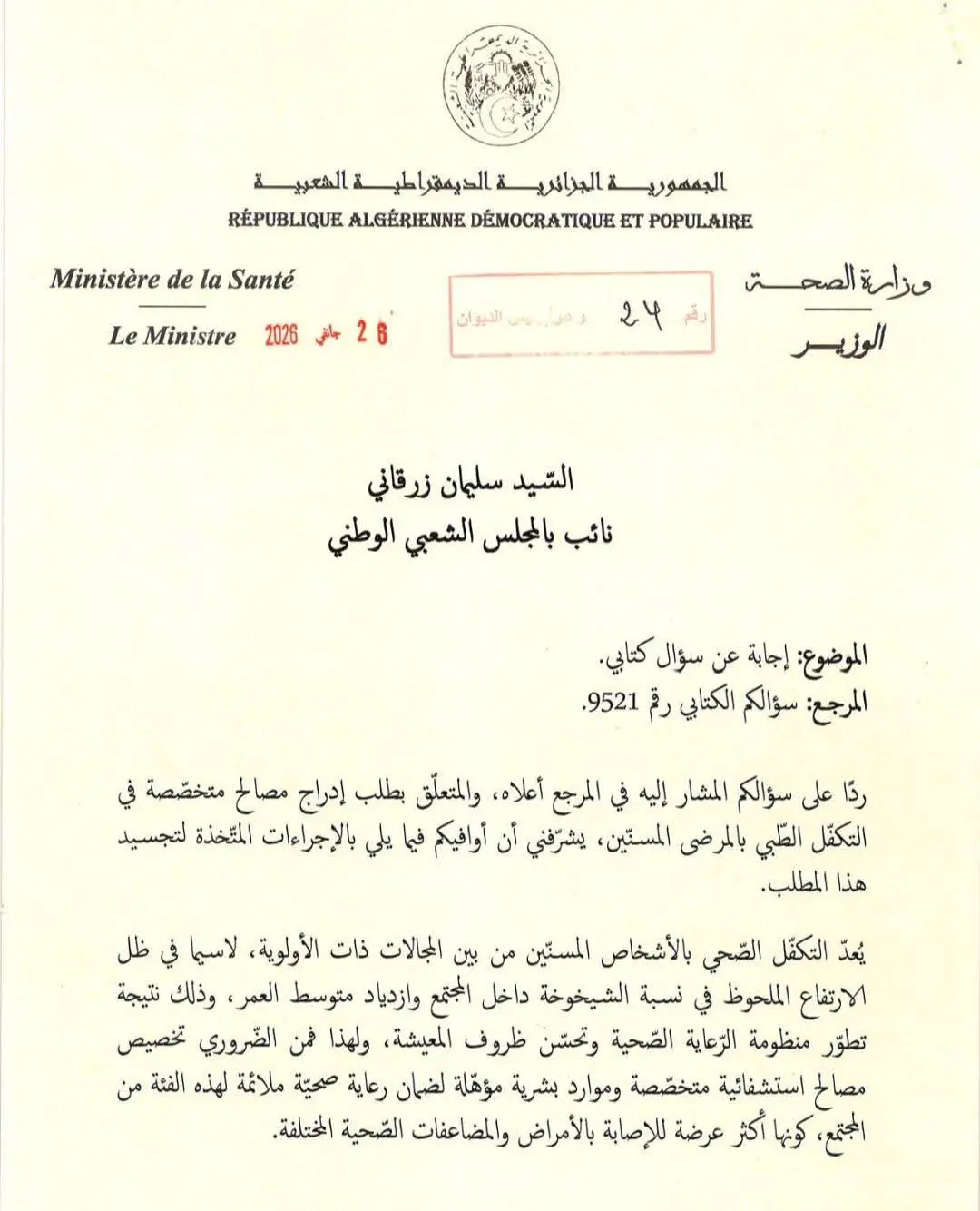 De son côté, le député Slimane Zerkani s’est félicité de la réponse du ministre, y voyant une confirmation officielle de la volonté de l’État de professionnaliser et de spécialiser les soins gériatriques en Algérie.