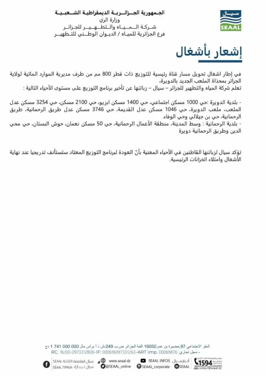 Selon un communiqué de la Société des Eaux et de l’Assainissement d’Alger (SEAAL), ces travaux, menés par la Direction des Ressources en Eau de la wilaya d’Alger, affecteront les quartiers suivants :
