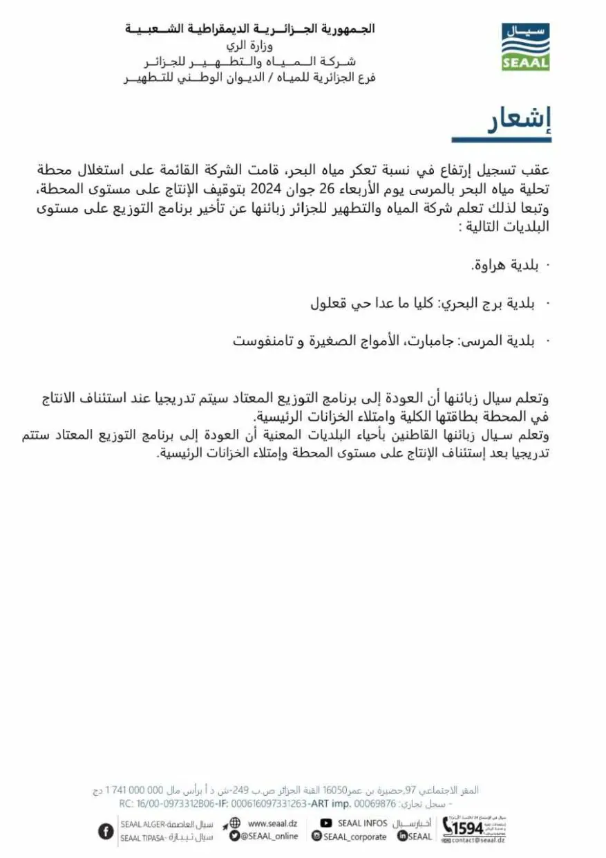 ALGER, le 27 juin 2024 – La Société des Eaux et de l’Assainissement d’Alger (SEAAL) informe ses clients d’une perturbation dans le programme de distribution d’eau potable au niveau de plusieurs communes de la wilaya d’Alger.