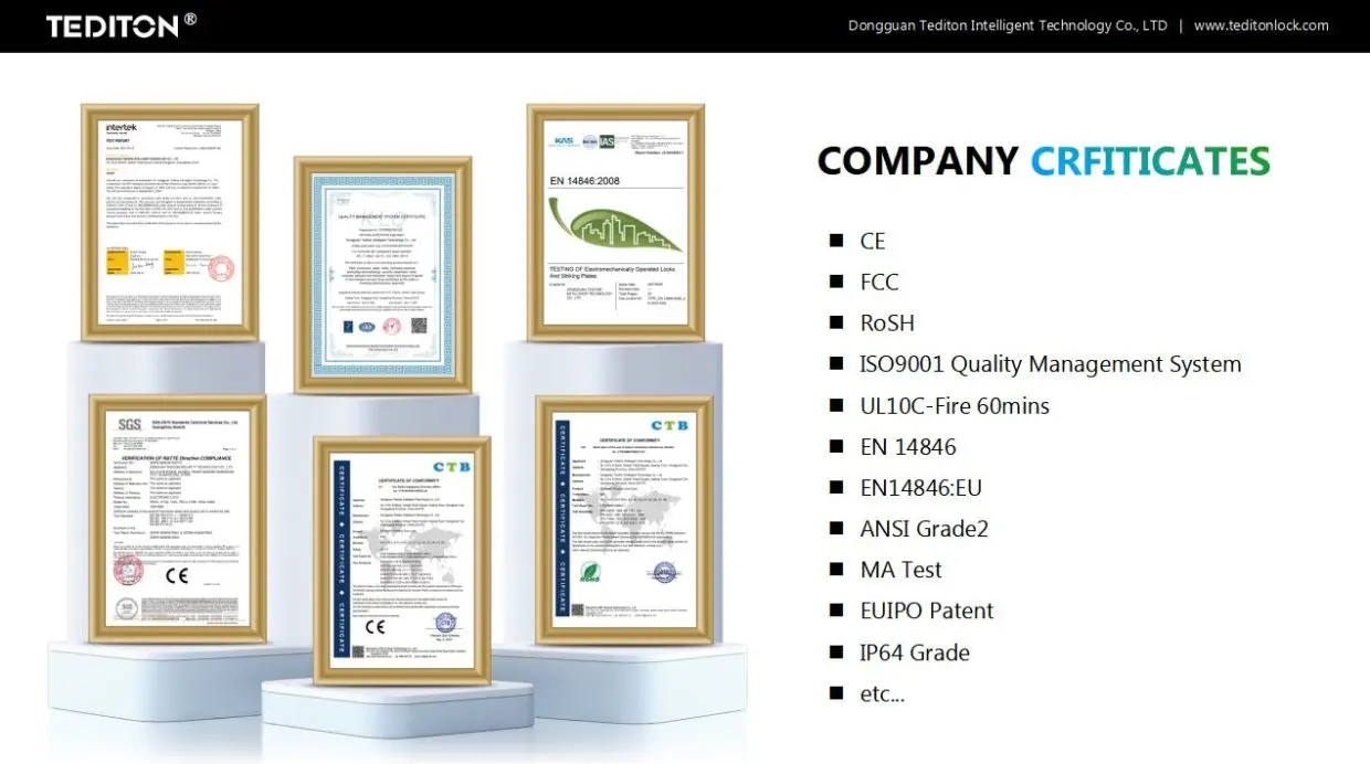 Tediton est spécialisé dans les verrous d’applications mobiles et les verrous de système en ligne, en s’alignant sur les dernières tendances technologiques. En exploitant ses propres brevets pour les serrures de porte et en se conformant aux certifications internationales telles que CE, FCC et ROHS, Tediton garantit que ses produits répondent à des normes de performance et de sécurité rigoureuses.