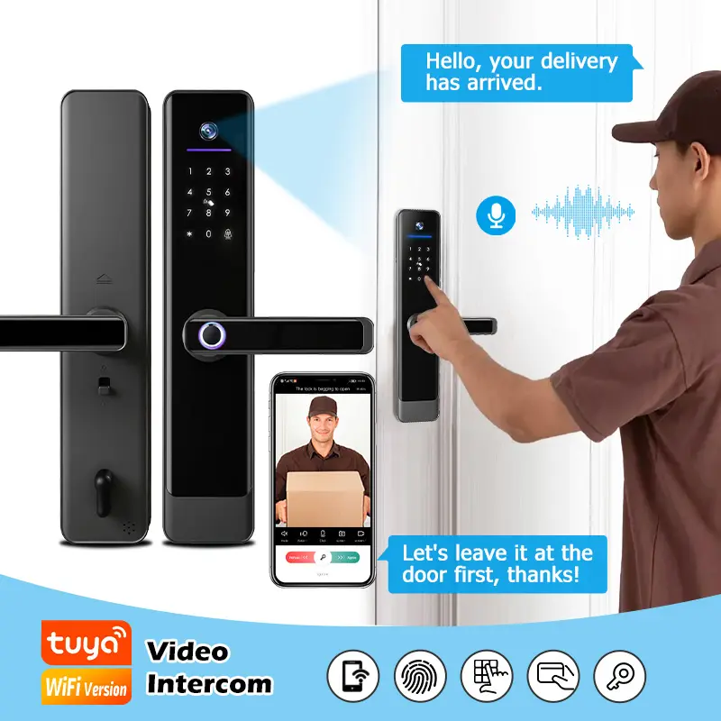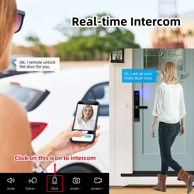 En utilisant la technologie d’interphone Tuya, la serrure de porte intelligente réalise une communication vocale bidirectionnelle en temps réel. Communiquez facilement avec les visiteurs ou les membres de votre famille, surveillez et déverrouillez à distance, où que vous soyez.