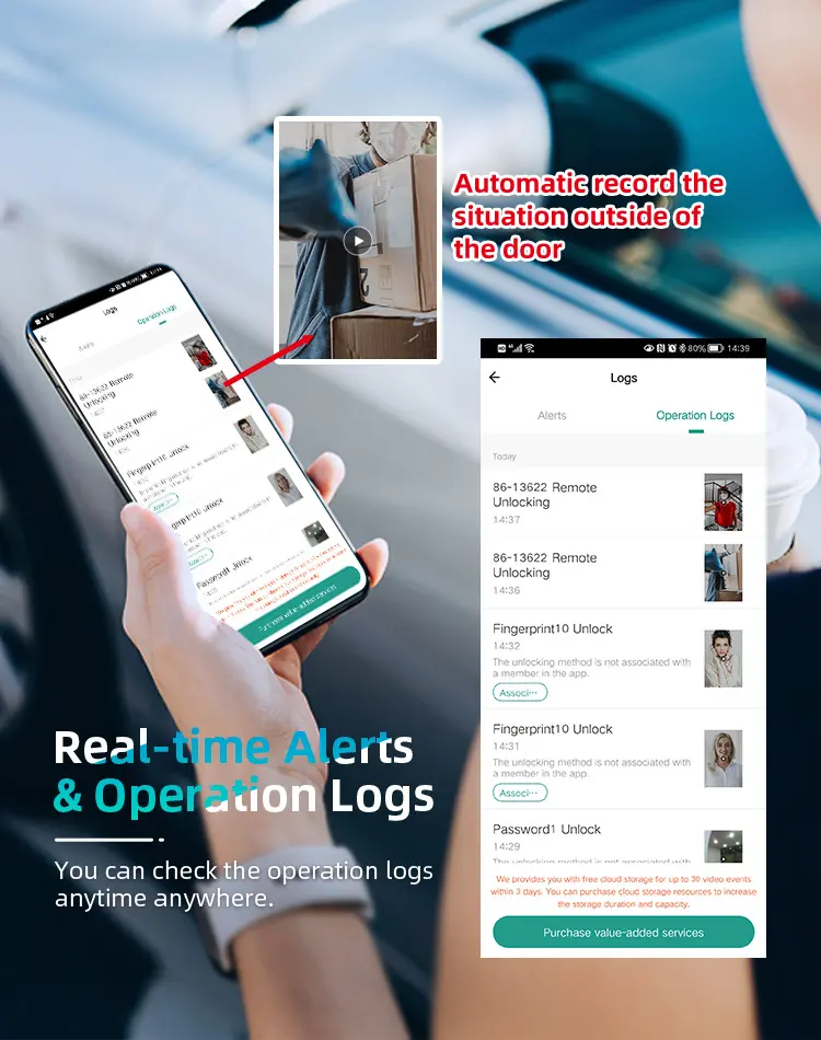 La serrure de porte intelligente Tediton F7 prend en charge la fonction d’enregistrement vidéo, qui peut facilement enregistrer les images d’entrée et de sortie et des visiteurs. Aidez à retrouver les colis perdus, à résoudre les litiges et à améliorer la sécurité de votre domicile. Suivre les enregistrements d’accès, enquête et vérification, tout est disponible.