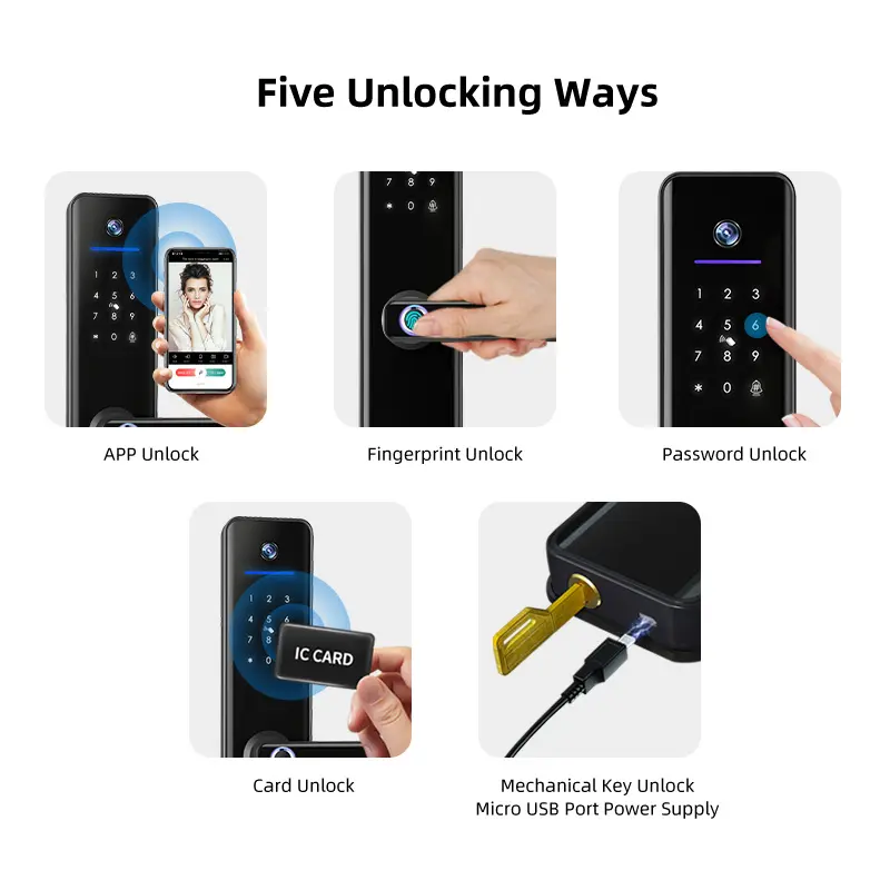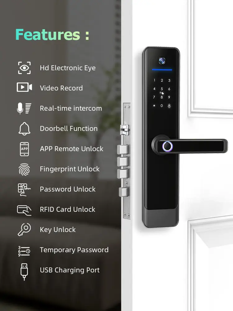 La serrure de porte intelligente Tediton F7 réalise une prise en charge multilingue et une communication vocale bidirectionnelle en temps réel grâce à la technologie d’interphone Tuya, offrant une expérience de serrure de porte intelligente pratique et sûre. Les yeux électroniques haute définition, l’enregistrement vidéo, l’interphone en temps réel et d’autres fonctions protègent la sécurité des membres de la famille de manière globale. La sonnette intégrée est une combinaison parfaite de tradition et d’intelligence, et l’application riche en fonctionnalités peut facilement contrôler la serrure de la porte. Une variété de méthodes de déverrouillage sécurisées et un port de chargement USB ajoutent de la flexibilité et de la commodité. La serrure de porte intelligente Tediton F7 a fait sensation dans l’industrie, offrant aux utilisateurs des solutions de contrôle d’accès sûres et pratiques.