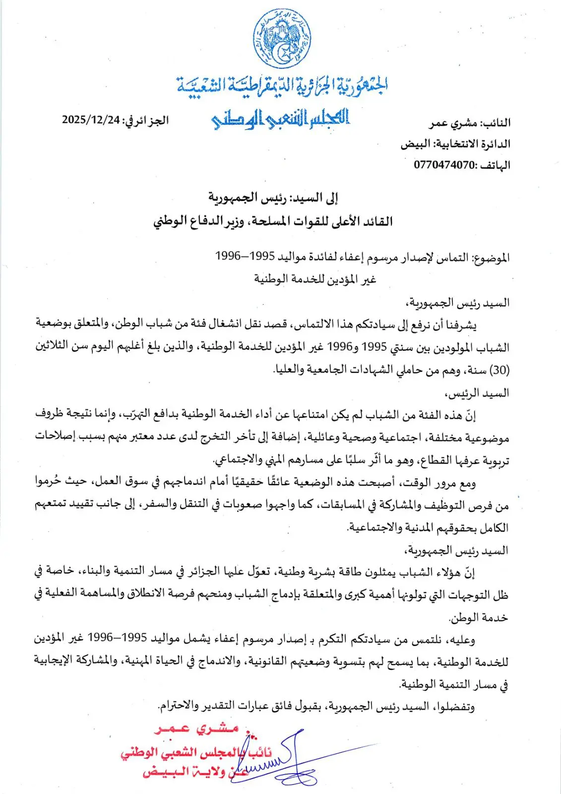 L’objet est explicite, solliciter l’émission d’un décret présidentiel accordant une exemption au service national aux jeunes Algériens nés en 1995 et 1996, non incorporés jusque-là.