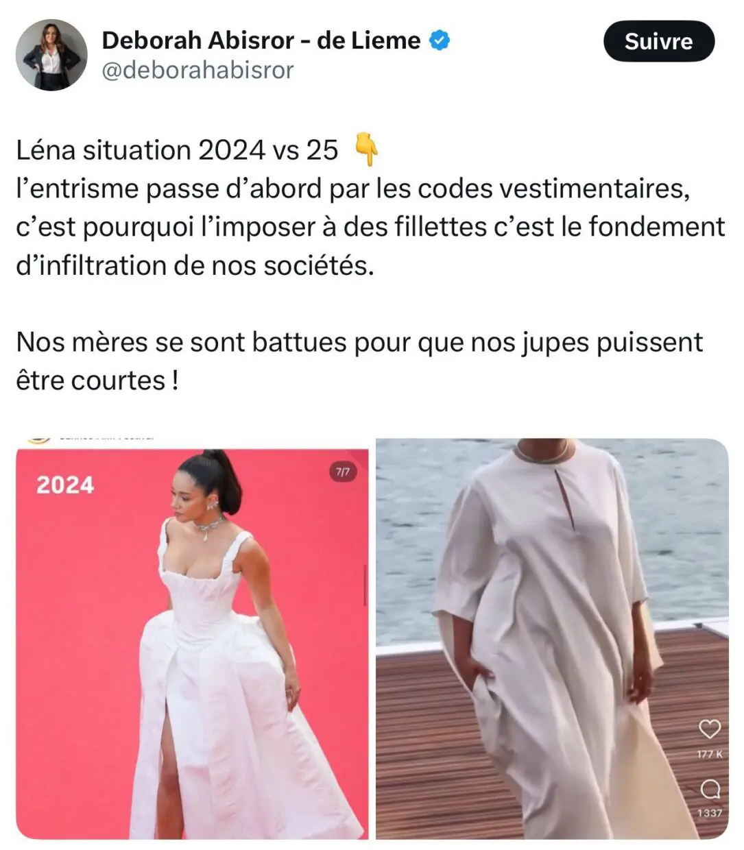 C’est à Cannes, lors du prestigieux gala Chopard en marge du Festival, que Léna Mahfouf — alias Léna Situations — a osé ce que certains considèrent encore en France comme un acte politique : porter une robe blanche ample accompagnée d’un foulard discret dans les cheveux. En Algérie ou dans d’autres pays musulmans, ce choix stylistique serait banal, voire élégant. Mais sur la Croisette, il est devenu un symbole de « menace islamiste » pour une élite politique française aux nerfs à vif.