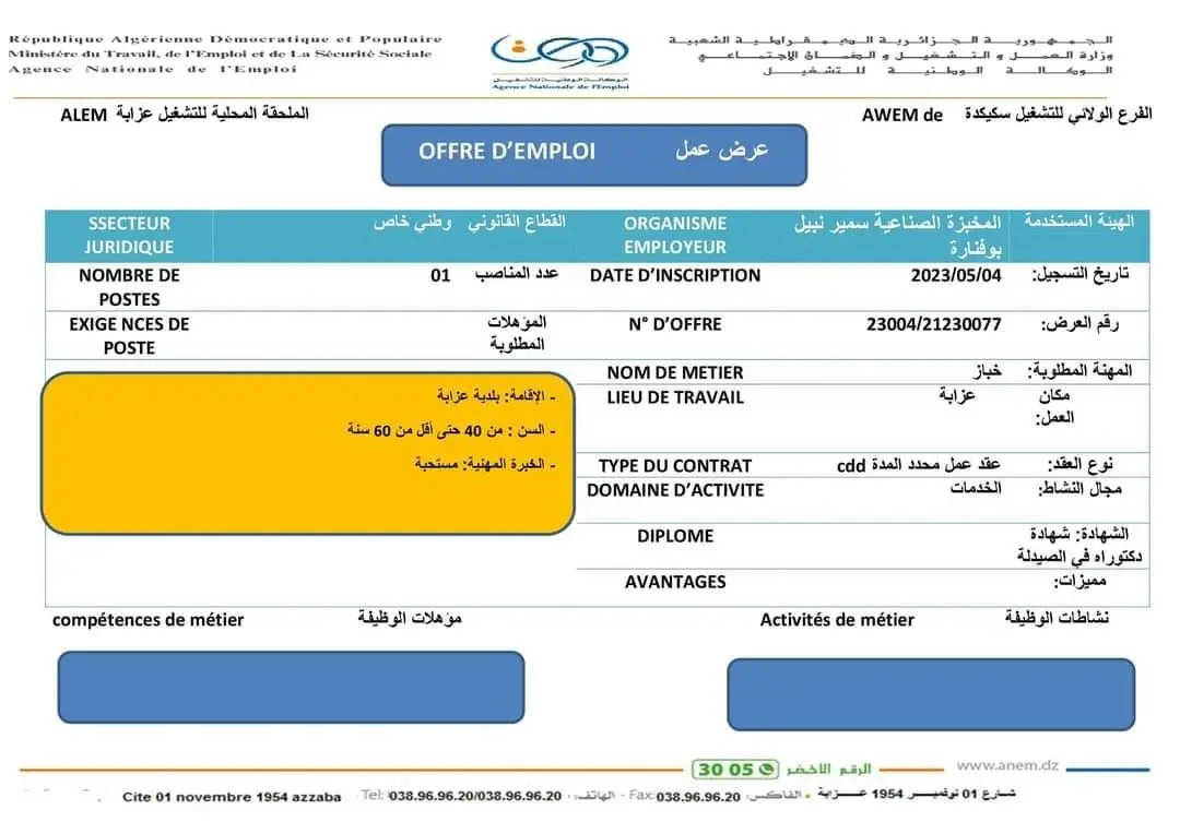 L’annonce, publiée par l’agence pour l’emploi de la wilaya de Skikda, offre un emploi pour un « boulanger » dans la boulangerie industrielle « Samir Nabil Boufenat ».