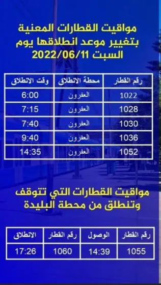 Pour ce samedi 11 juin, la société nationale des transports ferroviaires à informer les voyageurs du train N° 1055 que leur voyage prendra fin exceptionnellement à Blida. L’arrivée à la ville des roses est prévue à 14:39 comme l’indique le communiqué de la SNTF. En outre, cette dernière a annoncé que le train N° 1060 fera son départ, exceptionnellement, à 17:26 de Blida.