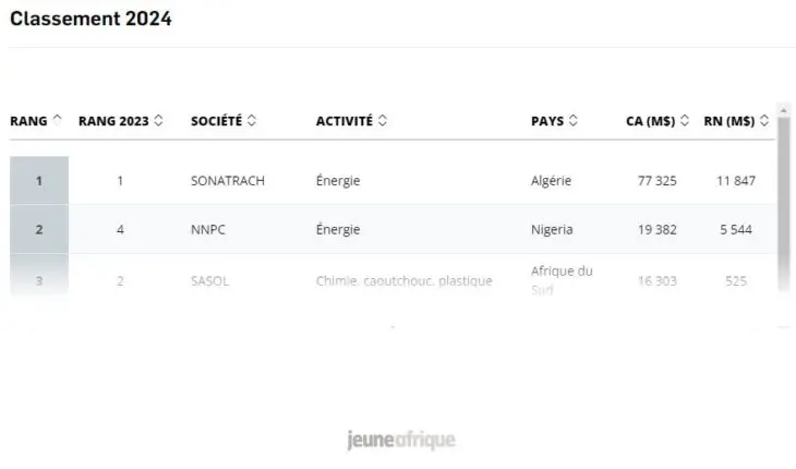 Le secteur de l’énergie et des mines tirent leur épingle du jeu, avec le groupe Sonatrach en tête du classement. Le géant pétrolier algérien conserve sa place de leader africain avec un chiffre d’affaires de 77,325 milliards de dollars et un résultat net de 11,847 milliards.