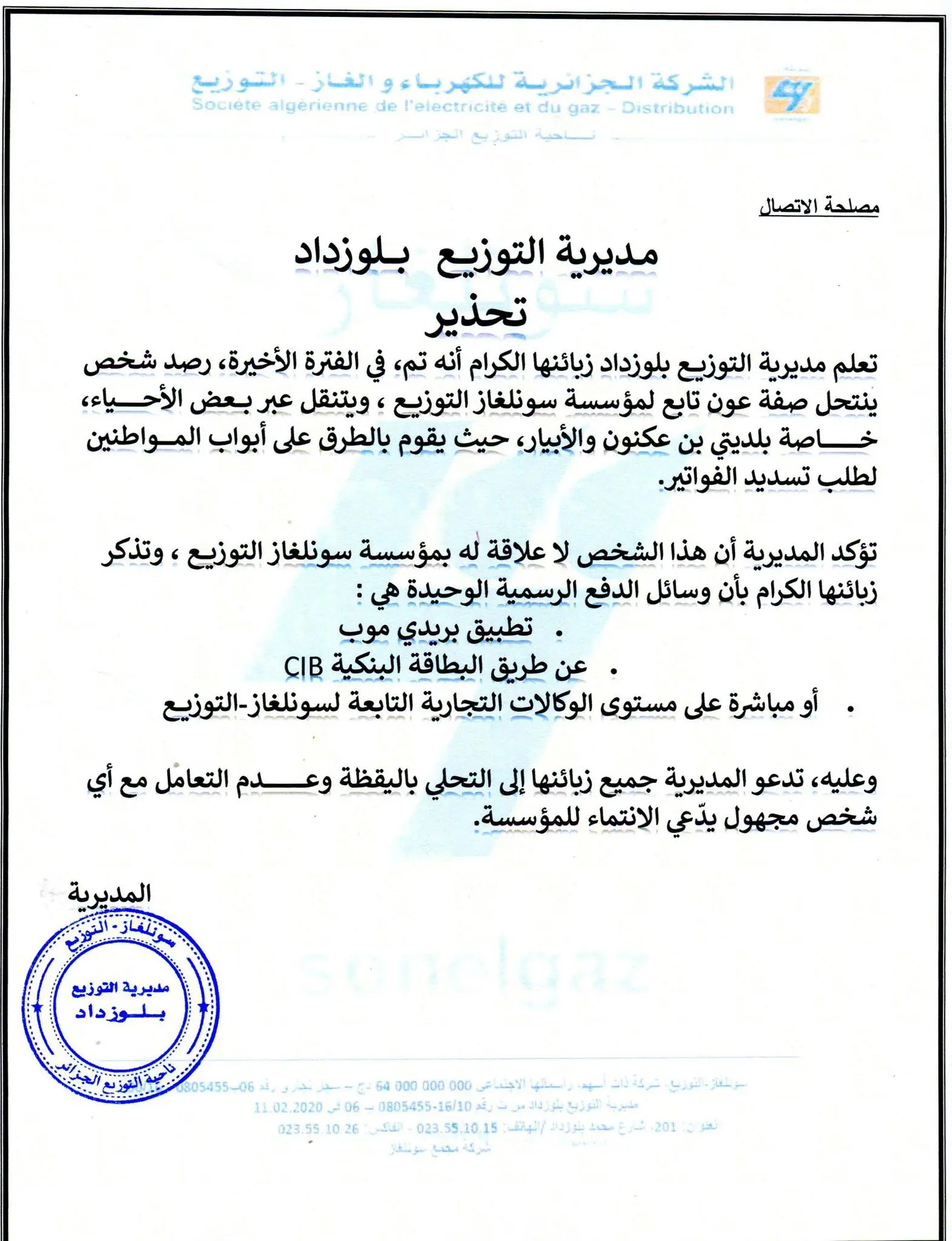 a Direction de distribution de Blouizdad, relevant de la Société algérienne de l’électricité et du gaz (Sonelgaz – Distribution), a lancé ce samedi une alerte à ses clients après avoir constaté la présence d’un individu se faisant passer pour un agent Sonelgaz.