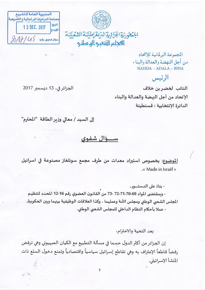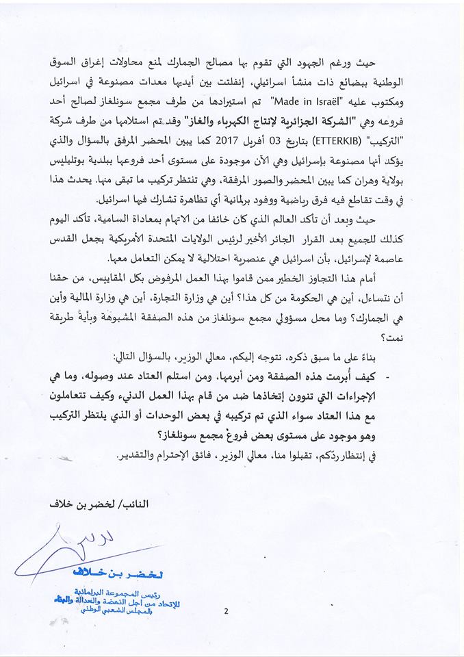 Dans une question orale au ministre de l’énergie Mustapha Guitouni , publié sur sa page, Lakhdar BenKhellaf s’interroge “malgré les efforts déployés par les douanes algériennes pour empêcher les tentatives d’inonder le marché national par des produits d’origine israélienne, on trouve des produits israéliens importés par Sonelgaz au profit de l’une de ses filiale” a-t-il écrit.