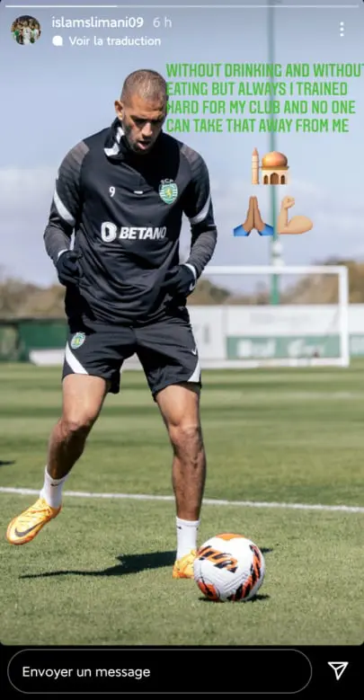 Ce vendredi, Islam Slimani est sorti de son silence et s’est exprimé, par le biais d’une story sur son compte Instagram, pour répondre à son entraîneur qui l’a mis à l’écart. Dans son message, l’attaquant algérien a affirmé que le jeûne ne l’empêche pas de s’entraîner avec dévouement pour son club.« Sans manger, ni boire, je me suis toujours entraîné avec dévouement pour mon club. Et personne ne peut m’enlever ça », lit-on sur la publication du talentueux attaquant des Verts.