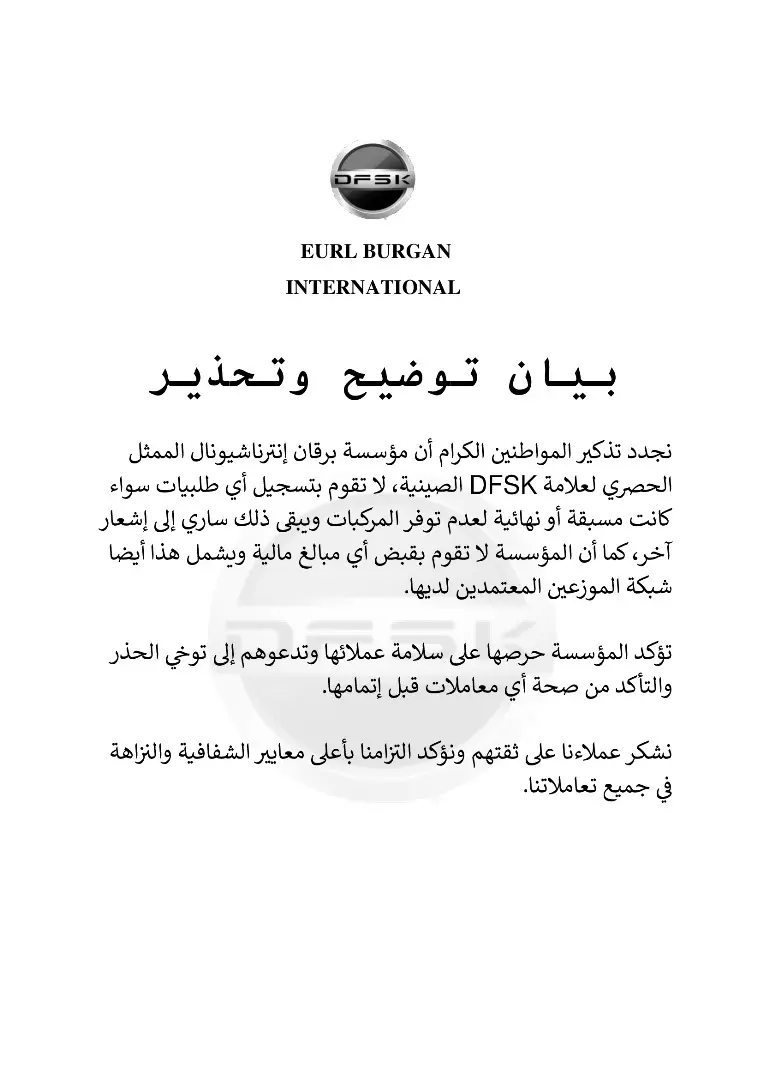 Le communiqué précise : « Nous tenons à rappeler à nos honorables citoyens que l’institution Burgan International, représentant exclusif de la marque chinoise DFSK, n’enregistre aucune commande. Qu’elle soit préliminaire ou définitive, en raison de l’indisponibilité des véhicules ».
