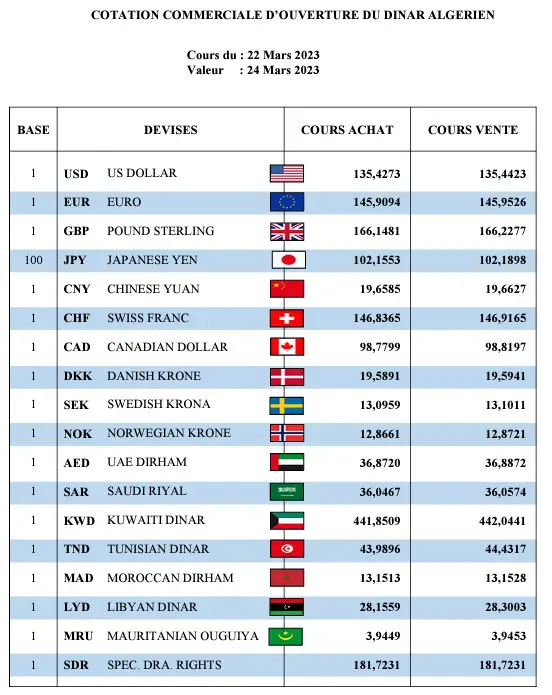 Ce jeudi 23 mars 2023, la monnaie européenne unique s’achète à 145.90 dinars algériens et se vend à 145.95 dinars algériens, ont indiqué les cotations commerciales d’ouverture du dinar algérien à la Banque d’Algérie du 22 au 24 mars 2023.