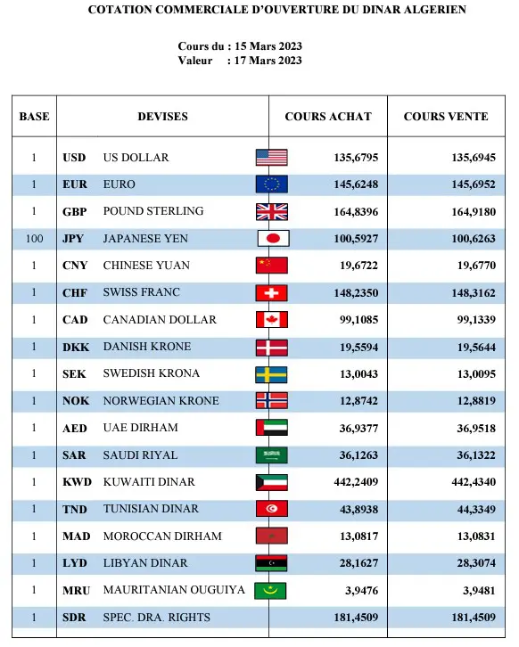 Le tableau ci-dessous résume les taux de change de la monnaie nationale face aux principales devises étrangères ce jeudi 16 mars 2023 :