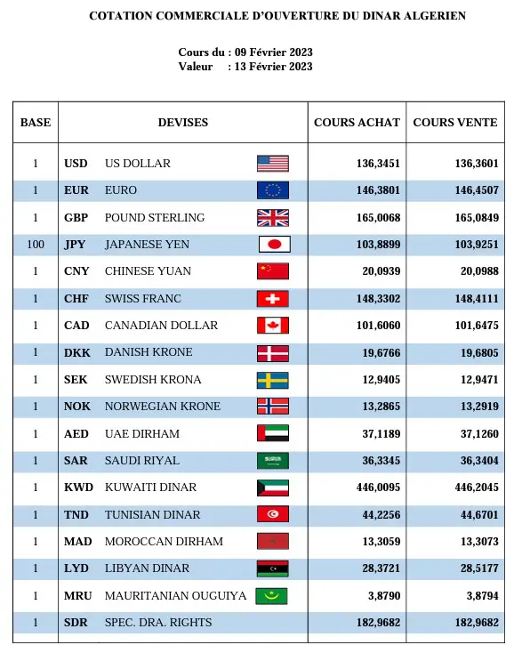 Pour ce dimanche 12 février 2023, les cotations officielles de la Banque d’Algérie affichent l’euro unique à 146.38 dinars algériens à l’achat et à 146.45 dinars algériens à la vente. Sur le même marché de change, le billet vert unique s’achète à 136.34 dinars algériens et se vend à 136.36 dinars algériens.