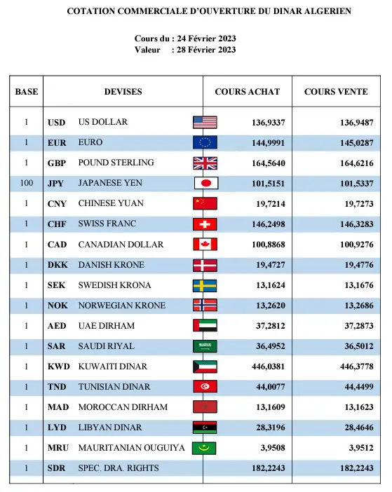 Les cotations commerciales d’ouverture du dinar à la Banque d’Algérie, du 24 au 28 février 2023, affichent la monnaie européenne unique à 144.99 dinars algériens à l’achat et à 145.02 dinars algériens à la vente. Alors que sur le marché noir de change, les cambistes échangent l’unité de cette même monnaie contre 221.00 dinars algériens à l’achat et contre 223.00 dinars algériens à la vente.
