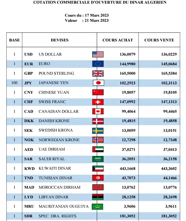 Les cotations commerciales d’ouverture du dinar algérien à la Banque d’Algérie du 17 au 21 mars 2023 indiquent que l’unité de l’euro s’échange contre 144.99 dinars algériens à l’achat et contre 145.06 dinars algériens à la vente.
