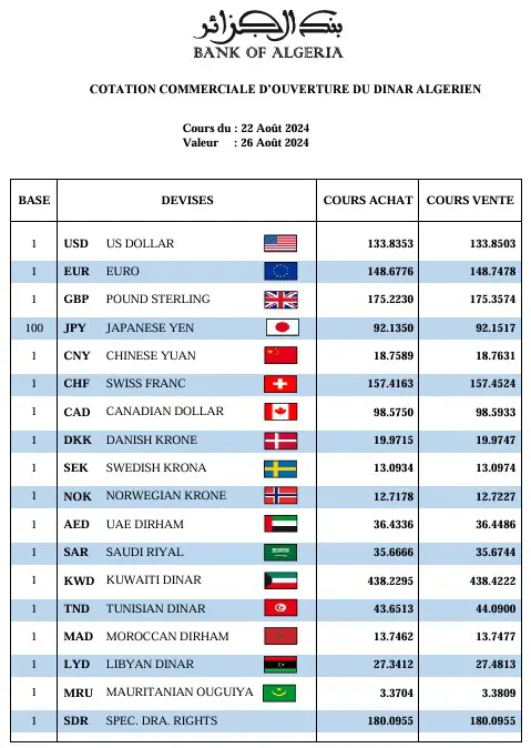 Quels sont les taux de change des devises en Algérie pour ce dimanche ?
