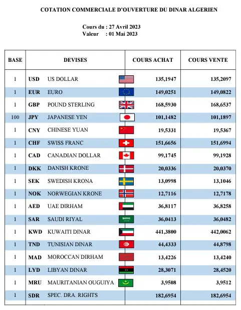 Selon les cotations commerciales du dinar algérien à la Banque d’Algérie du 07 avril au 01 mai 2023, le taux d’achat de la monnaie européenne unique s’est établi à 149.02 dinars algériens et son taux de vente à 149.08 dinars algériens. D’après la même source, il est possible d’acheter le dollar américain unique à 135.19 dinars algériens et de le vendre à 135.20 dinars algériens.