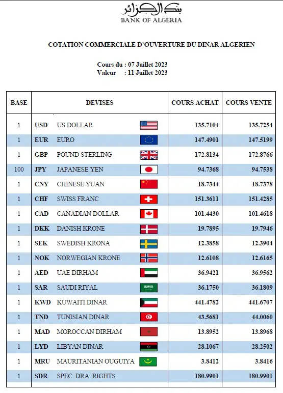 D’après les cotations commerciales d’ouverture du dinar algérien en Banque du 7 au 11 juillet 2023, l’unité de la monnaie européenne s’achète à 147.49 dinars algériens et se vend à 147.51 dinars algériens. Tandis que le dollar américain unique s’échange contre 135.71 dinars algériens à l’achat et contre 135.72 dinars algériens à la vente.