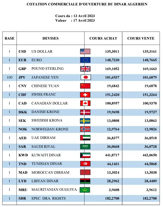 Selon les cotations commerciales d’ouverture du dinar algérien en Banque du 13 au 17 avril 2023, il est possible d’acheter l’euro unique à 148.72 dinars algériens et de le vendre à 148.76 dinars algériens. D’après la même source, le taux d’achat du dollar américain s’est établi à 135.30 dinas algériens et son taux de vente à 135.31 dinars algériens au niveau de la Banque d’Algérie.