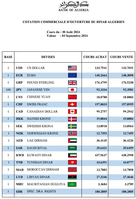 Les dernières données de la Banque d’Algérie, couvrant la période du 30 août au 3 septembre 2024, révèlent une relative stabilité des principales devises étrangères sur le marché officiel. Cependant, un écart significatif persiste entre les taux de change officiels et ceux du marché informel, où les devises s’échangent à des valeurs nettement plus élevées.