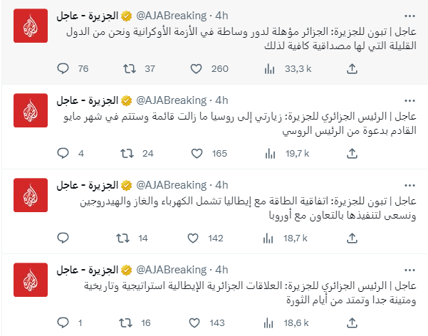 عناوين مقابلة الرئيس الجزائري عبد المجيد تبون التي ستذاع لاحقا على قناة الجزيرة. #الجزائر #الرئيس_تبون #الجزيرة #خديجة_بن_قنة #Algérie #président_Tebboune #اكرانيا #روسيا #Ukraine #Russie #France #Paris #Alger @Benguennak @TebbouneAmadjid pic.twitter.com/xM03KqFbHT